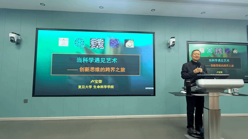 卢宝荣教授以“当科学遇见艺术:创新思维的跨界之旅”为题,作了一场融通文理、贯通教学与科研的专题报告。他从个人科研与教学实践出发,结合复旦大学公司产品改革经验,系统阐述了在“创新驱动高质量发展”背景下,跨学科融通与思维跨界对创新人才培养的重要意义。