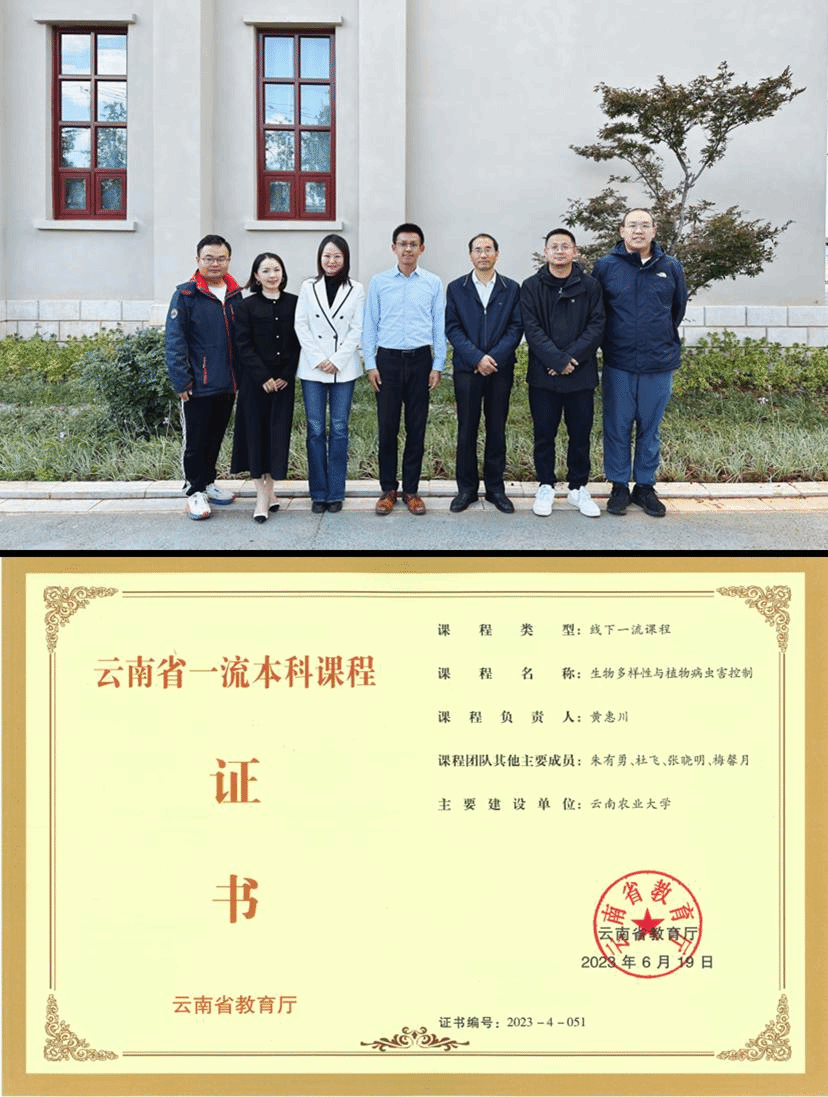 本教学团队长期开展“生物多样性与植物病虫害控制”课程的教学和教研工作,该课程是研究利用农业生物多样性控制作物病虫害的效应、原理和方法的植物保护专业特色课程。课程主要讲授利用作物遗传多样性、品种多样性等控制作物病虫害的效应和原理以及构建农业生物多样性种植系统的原则和方法,同时介绍生物多样性控制植物病虫害领域的新技术、新方法和新成果。教学团队自2001年由朱有勇院士牵头组建,至今已有20多年的发展历史,李成云教授、王云月教授、何霞红教授、朱书生教授、陈斌教授等多位资深专家先后在团队任教,为教学团队的建设与发展作出了重要的贡献。团队讲授的课程“生物多样性与植物病虫害控制”2007年被列为国家级精品课程;2009年以该课程建设为核心的“农业生物多样性创新人才培养基地建设与实践”获国家级教学成果二等奖;2012年入选国家级精品视频公开课;2023年包含本课程建设的“基于脱贫攻坚的农科应用型人才培养体系构建与实践”荣获云南省教学成果特等奖和国家教学成果二等奖;2021年入选省级一流本科课程;2023年入选国家级一流本科课程。