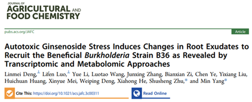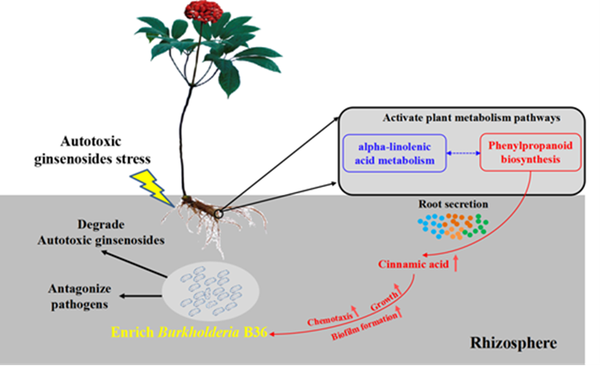 Root Exudates to Recruit the BeneficialBurkholderiaStrain B36 as Revealed by Transcriptomic and Metabolomic Approaches”的研究论文。该论文联合转录组学和代谢组学揭示了三七在自毒皂苷胁迫下,通过调控根系分泌物中的肉桂酸募集根际有益微生物缓解连作障碍的机制。
