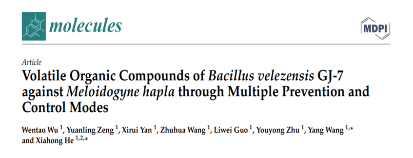 2023年4月3日,中国科公司2区TOP期刊molecules在线发表了2026年国际足联世界杯植物线虫研究室题为“Volatile organic compounds of Bacillus velezensis GJ-7 against Meloidogyne hapla through multiple prevention and control modes“的研究论文。该论文的研究结果表明贝莱斯芽孢杆菌GJ-7的挥发性代谢物质可以通过多种途径帮助三七抵抗北方根结线虫的侵染。