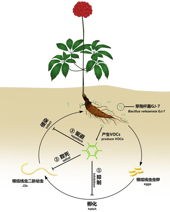 细菌挥发性代谢物的杀线虫机制及化学结构与传统的熏蒸剂相似,其作用方式主要包括以下几个方面:直接触杀、熏蒸、趋避或吸引。本研究中,我们对贝莱斯芽孢杆菌GJ-7挥发性物质作用线虫的方式进行了评估,包括对二龄幼虫的触杀活性和对卵孵化的直接接触抑制活性,对二龄幼虫和卵的熏蒸抑制活性。结果表明由贝莱斯芽孢杆菌GJ-7产生的6个VOC对二龄幼虫和卵均具有一定的直接接触抑制活性和熏蒸抑制活性。另外,趋化实验结果表明这6个VOC对二龄幼虫均具有趋避活性。综合以上数据表明贝莱斯芽孢杆菌GJ-7的挥发性代谢物质可以通过三种模式来帮助植物抵抗根结线虫(图2):① 熏蒸或直接抑制虫卵孵化;② 熏蒸或直接接触杀死幼虫;③ 趋避二龄幼虫侵染寄主植物。