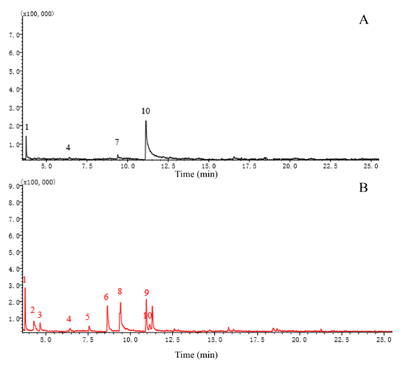 图1 顶空固相微萃取结合GC/MS分析挥发性物质成分;(A) LB培养基;(B)菌株GJ-7发酵上清液。