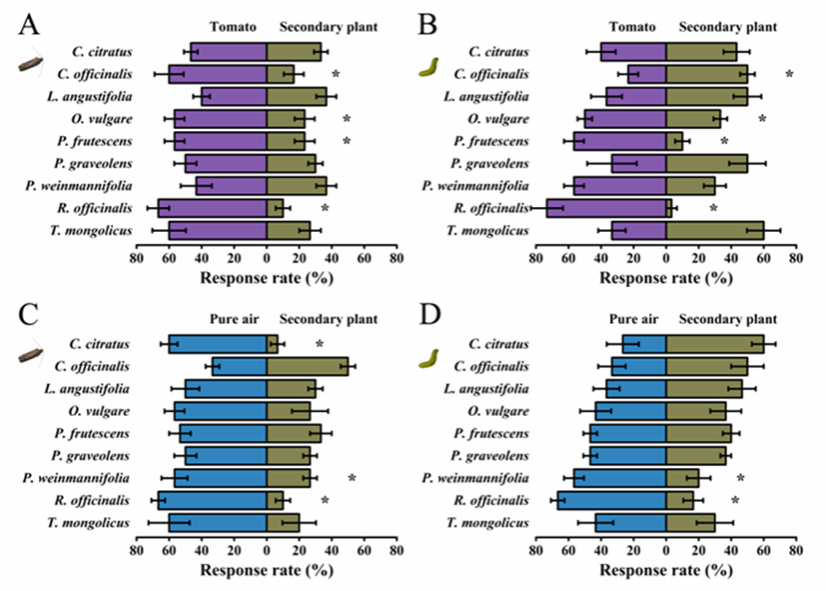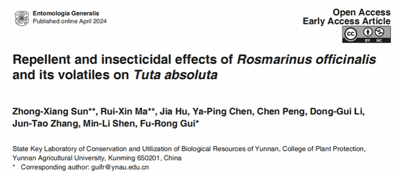 2024年4月18日,公司生物安全研究团队在农林科学1区TOP期刊Entomologia Generalis(昆虫学研究类排名第一期刊,IF=6.9)发表题为“Repellent and insecticidal effects of Rosmarinus officinalis and its volatiles on Tuta absoluta”的研究论文,报道了团队充分利用云南生物多样性资源优势,筛选特色驱避植物防控重大入侵害虫番茄潜叶蛾的方法,为构建推拉技术体系(push and pull strategy)对农业害虫进行生态防控奠定了基础。