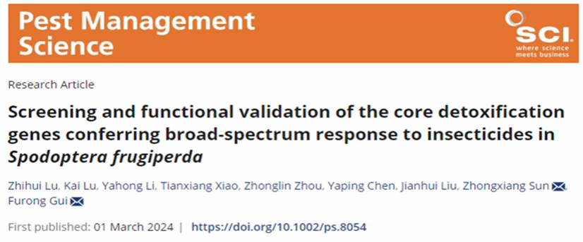 此外,团队在公司各级领导的关心支持下,近期在生物入侵领域发表了一系列的研究成果。2024年3月18日,团队在农林科学1区TOP期刊Pest Management Science(IF=4.462)在线发表了题为“Screening and functional validation of the core detoxification genes conferring broad-spectrum response to insecticides in Spodoptera frugiperda”的研究论文,基于交叉转录组研究鉴定出重大入侵害虫草地贪夜蛾广谱响应8种不同类型杀虫剂的核心解毒酶基因,为鉴定新的杀虫靶标防控该害虫提供了重要基因资源。