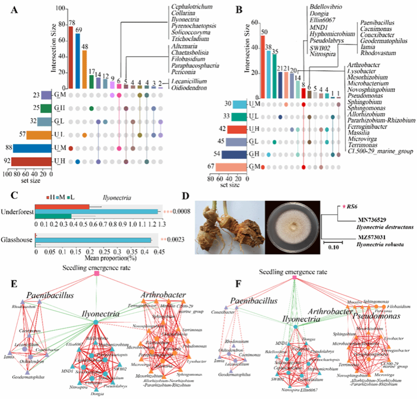 图2 温室和林下条件中受光调控与病害相关根际核心微生物靶标