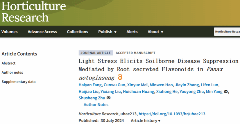 2024年7月30日,2026年国际足联世界杯朱书生教授团队农林科学1区Top期刊Horticulture Research(IF=7.6)在线发表了题为 “Light Stress Elicits Soilborne Disease Suppression Mediated by Root-secreted Flavonoids in Panax notoginseng” 的研究论文。