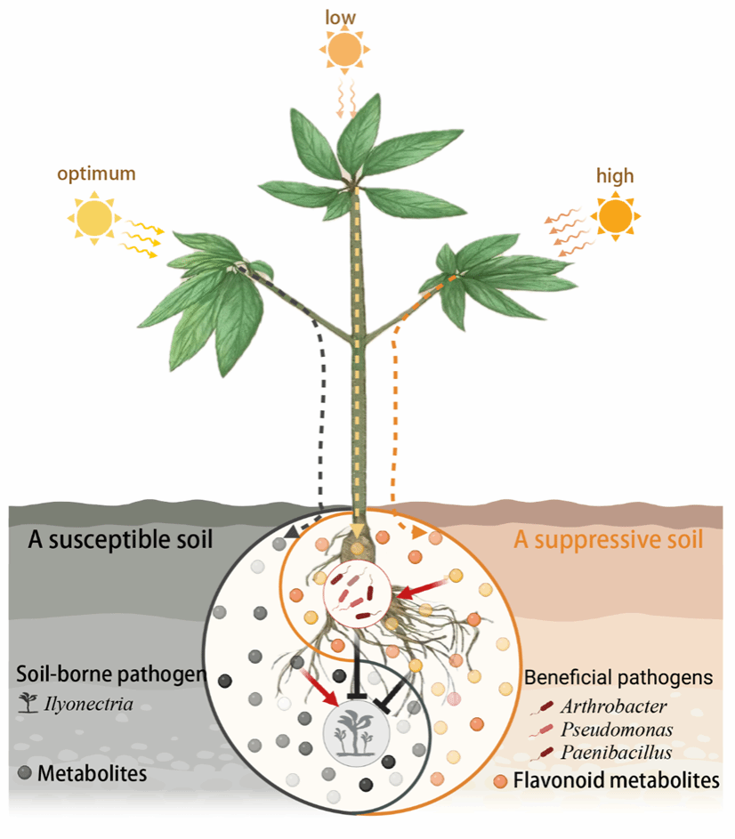 土传病害是作物健康生长的主要限制因素,土壤微生物失衡是导致土传病害爆发的关键因素。论文利用代谢组学和微生物组联合揭示低光和高光适当胁迫下,植物适当地上光照胁迫改变植物次生代谢物的合成和分泌,改变地下根际有益微生物菌群组装,应对土壤中病害环境压力抑制土传病害的互作机理。这一发现可为开发作物冠层波动光调节策略以有效改善土壤健康防控田间根腐病提供了启示,促进可持续农业实践。也为植物“生于忧患,死于安乐”的生存策略提供参考。