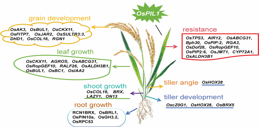 本文通过构建OsPIL1过表达转基因水稻株系,研究发现OsPIL1促进水稻生长、谷粒发育和稻瘟病抗性,进一步,借助多组学(转录组、代谢组和CUT&Tag)全面解析OsPIL1在促进水稻理想农艺性状(长势好、谷粒长和抗性强等)方面的调控作用及其调控机制。作用明确水稻光敏色素互作类因子OsPIL1在解决产量—抗性权衡难题方面具有较好应用前景的育种“工具”。