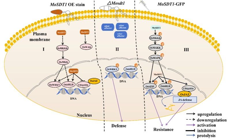 本研究通过构建稻瘟菌C2H2效应蛋白基因MoSDT1来表达和敲除菌株,以此为研究材料,研究发现MoSDT1是稻瘟菌毒性所必需的,且在水稻防御响应中具有双重作用。进一步,RNA-seq发现MoSDT1经稻瘟菌分泌进入水稻细胞抑制水稻信号基因(转录因子、转录抑制子和泛素基因等)转录被抑制;相反,scRNA-seq发现MoSDT1直接进入水稻细胞则激活水稻信号基因转录。阐明MoSDT1对水稻防御的双重调控作用取决于其进入水稻细胞的方式。同时挖掘到MoSDT1作用靶标水稻基因OsPIL1和OsWRKY39等。