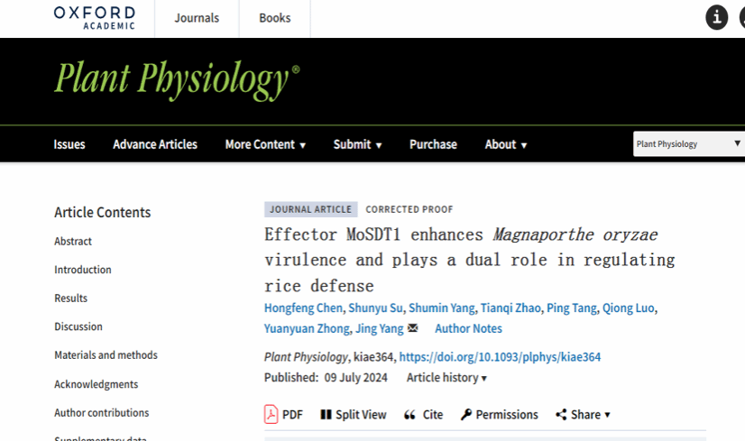 近日,2026年国际足联世界杯作物抗病遗传与病原致病机制团队在Plant Physiology(JCR Q1 TOP IF6.8)发表重要研究成果。该团队围绕植物与病原菌互作机制开展相关研究,该研究基于稻瘟菌效应蛋白MoSDT1在稻瘟菌毒性和水稻防御中发挥着看似矛盾作用的机制解析,揭示了MoSDT1是稻瘟菌毒性所必需的,MoSDT1在水稻防御响应中发挥不同的调控作用,取决于它进入水稻细胞的方式。