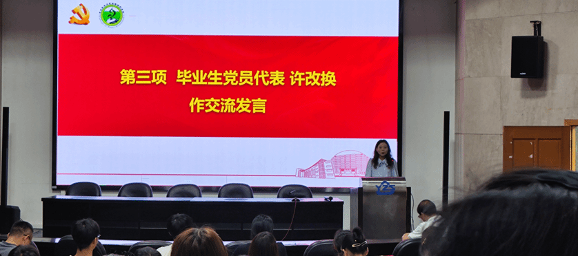 毕业生党员代表许改换同志作交流发言,许改换同志表示,青年一代的我们应该牢记党员身份,增强党员意识,坚定不移听党话、跟党走,努力成长为堪当民族复兴重任的时代新人。