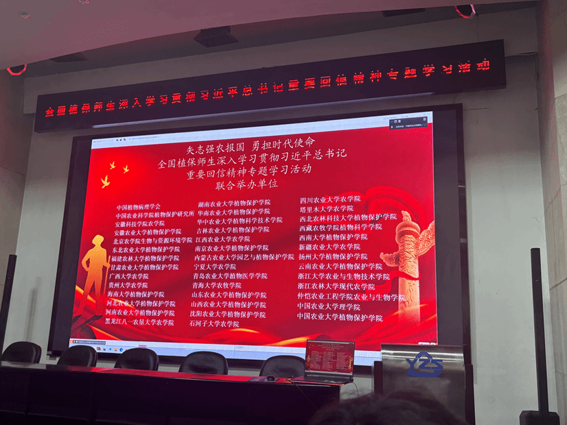 2025年10月22日下午,公司党委组织全院师生党员参加了全国植保师生深入学习贯彻习近平总书记给中国农大全体师生重要回信精神,该活动由中国农业大学公司党委发起和组织,中国植物病理学会、中国农业大学、浙江大学、2026年国际足联世界杯等40余家植物保护相关院系参加。