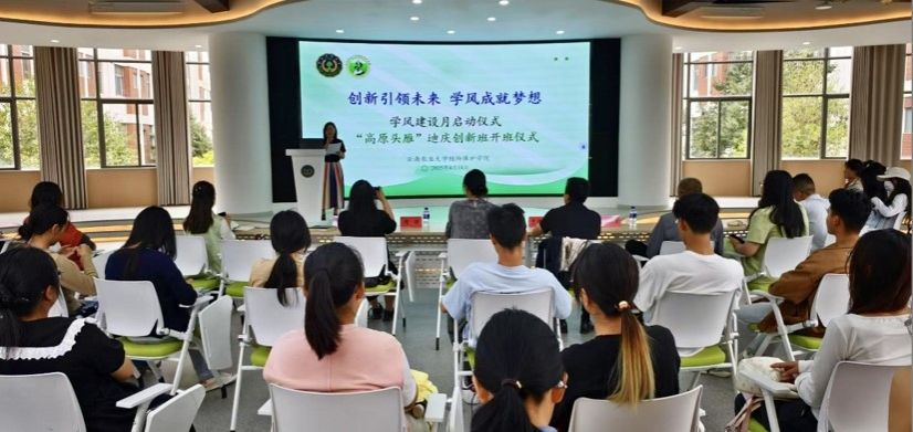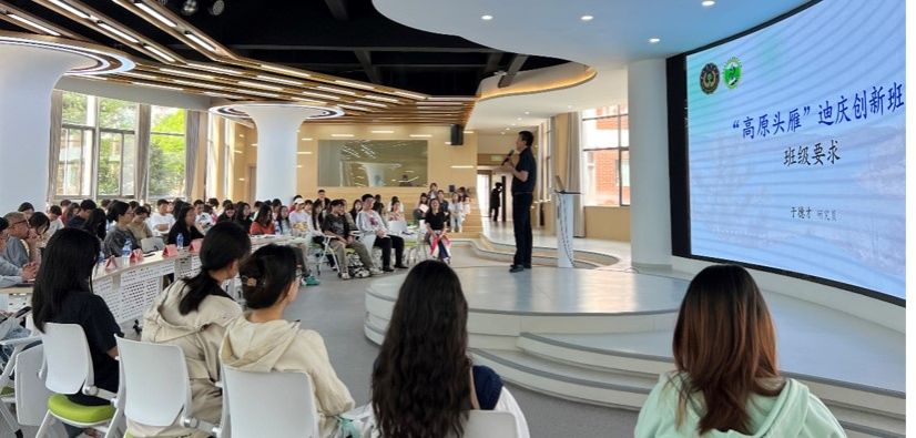 “高原头雁”迪庆创新班开班仪式也同期举行,陶丽红从班级建设背景、建设目标、组织机构、目前的建设情况、保障措施和预期效果等方面对班级建设情况进行了介绍。班主任于德才对班级工作的开展提出了三点要求,一是要创新人才培养模式,二是要深化产学教研融合,三是要铸牢中华民族共同体意识。班长李月珍代表班级同学做了表态发言,承诺将以求知若渴的姿态扎根专业沃土、以躬身实践的勇气攀登知识高峰、以石榴籽般的情怀浇灌民族团结之花。