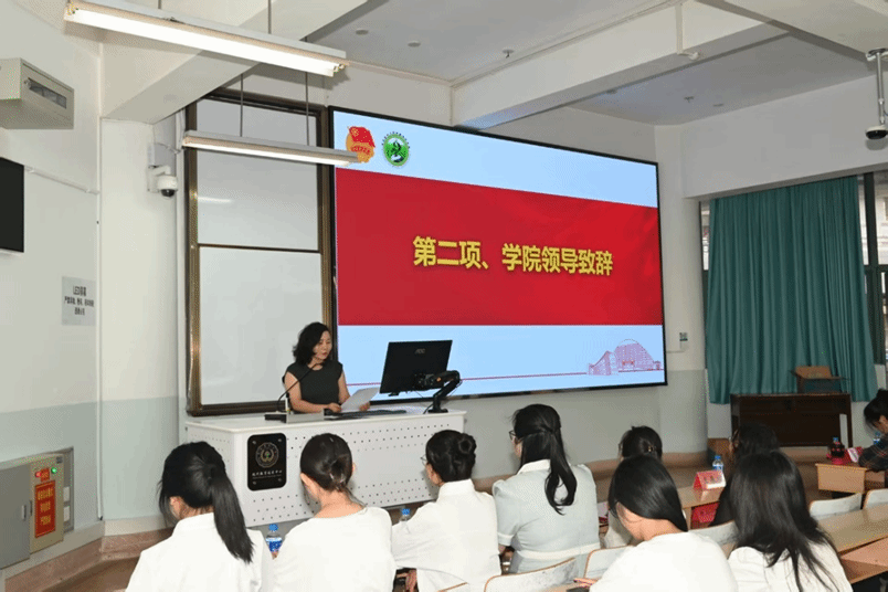 随后举行新团员入团仪式。全体团员重温入团仪式,新团员代表张雅琪表达了入团感受,阐述了未来的行动目标。随后,老团员为新团员佩戴团徽,象征红色基因的传承。