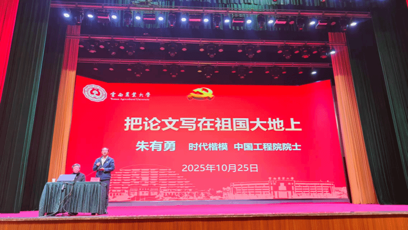 公司特别邀请了“时代楷模”、中国工程院院士朱有勇作《把论文写在祖国大地上》专题报告。报告中,朱院士以个人发展历程为脉络,生动讲述了学农爱农,坚定信念、开拓创新,把论文写在祖国大地上的科研故事。院士 “心怀‘国之大者’,深耕科研沃土” 的感人事迹,让在场新生深刻感受到 “把论文写在祖国大地上” 的使命担当。
