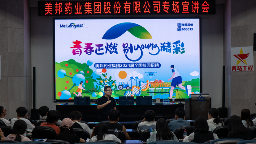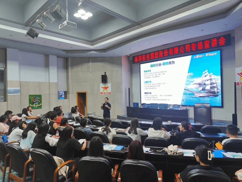 首先,孙欢着重介绍了行业现状和企业概况。他指出,农业是立国之本,农业的发展需要农药的支持,农药企业有广阔的发展前景。而美邦药业底蕴深厚,富有活力和创造力,有优良的企业文化和多方面的企业福利。随后,孙欢与毕业生进行现场互动交流,针对同学们所关心的薪资待遇、办公地点、面试流程等问题进行答疑,使同学们対美邦药业有更深入的了解。