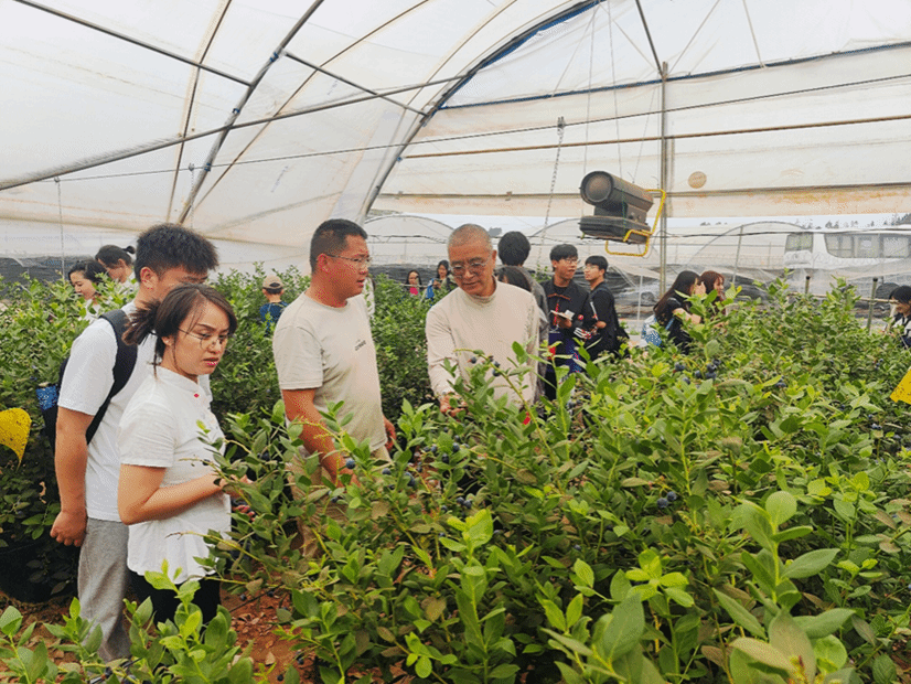 随后,师生们来到国家林业产业化重点龙头企业、高新技术企业紫约农业有限公司石林分公司,基地经理康玉朋向师生介绍了公司种植规模、人才需求、经营现状并就蓝莓无土栽培及日常养护管理相关知识进行了现场交流探讨。