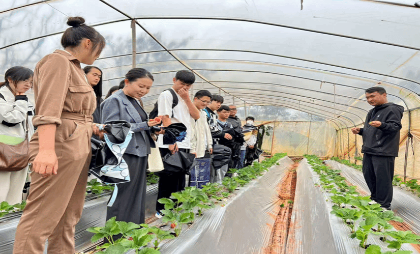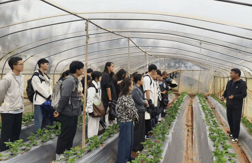 一行人首先走进企业的种植示范基地,上了一堂生动的“田间实践课”。云南骄宇科技专业合作社总经理王鸿宇详细介绍了树莓和草莓从种苗培育、智慧种植、水肥管理、病虫害绿色防控的全链条技术,并展示了其成果深加工成果醋、化妆品等多元化产品的全产业链运营模式,让师生们直观感受到现代农业的科技魅力与市场潜力。在昆明初野农业家庭农场,周津志总经理则分享了其将绿色种植与共享菜园、亲子科普等新业态相结合的成功经验,展现了现代农业的无限可能。这堂“大棚课堂”不仅让员工开阔了眼界,更让他们对所学专业的应用前景有了更深刻的认识。
