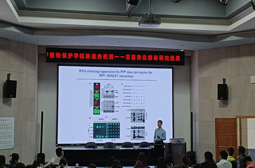 韩成贵教授主要围绕“芸薹黄化病毒的研究进展”主题展开,主要介绍了一种新提出的侵染中国芸薹属的极化病毒(BrYV)的三种基因型的分子特征;同时就BrYV在中国大陆的发生和分布情况,以及目前国内多家院校及科研机构的研究情况进行了介绍。在分析病毒siRNA在BrYV和PEMV-2之间的协同作用、Polerovirus Pa3中保守的脯氨酸18对BrYV全身感染的重要性、芸薹黄化病毒运动蛋白上调导致花青素积累使得植物紫叶症状发展、BrYV PO蛋白的功能分析及其对本氏拟南芥NbRAF2的抗病毒活性的削弱等方面,带领公司师生深入了解何为芸薹黄化病毒,以及目前针对该病毒的最新研究进展。韩教授的讲授精彩生动,还将自身经历融入其中,增强了趣味性和故事性,帮助同学们更好地理解讲座内容,使同学们受益匪浅。