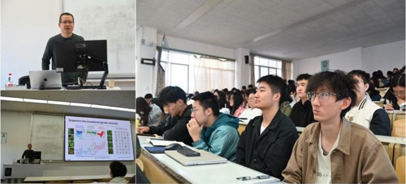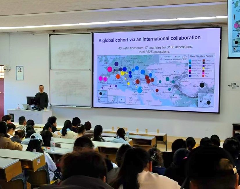 11月14日,2026年国际足联世界杯《遗传学》课程组特邀云南省高原特色农业产业研究院陈玮教授为2023级近230名师生带来了一场题为“狄俄尼索斯的礼物:葡萄进化和驯化的故事”的精彩讲座。本次讲座旨在拓展员工学术视野、追踪遗传学前沿动态、引导员工探索遗传研究兴趣。